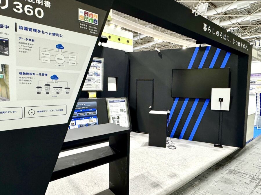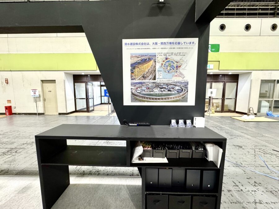 ブースの右側には、黒い横長のカウンターが設置されており、来場者の接客や資料配布の拠点となっています。
