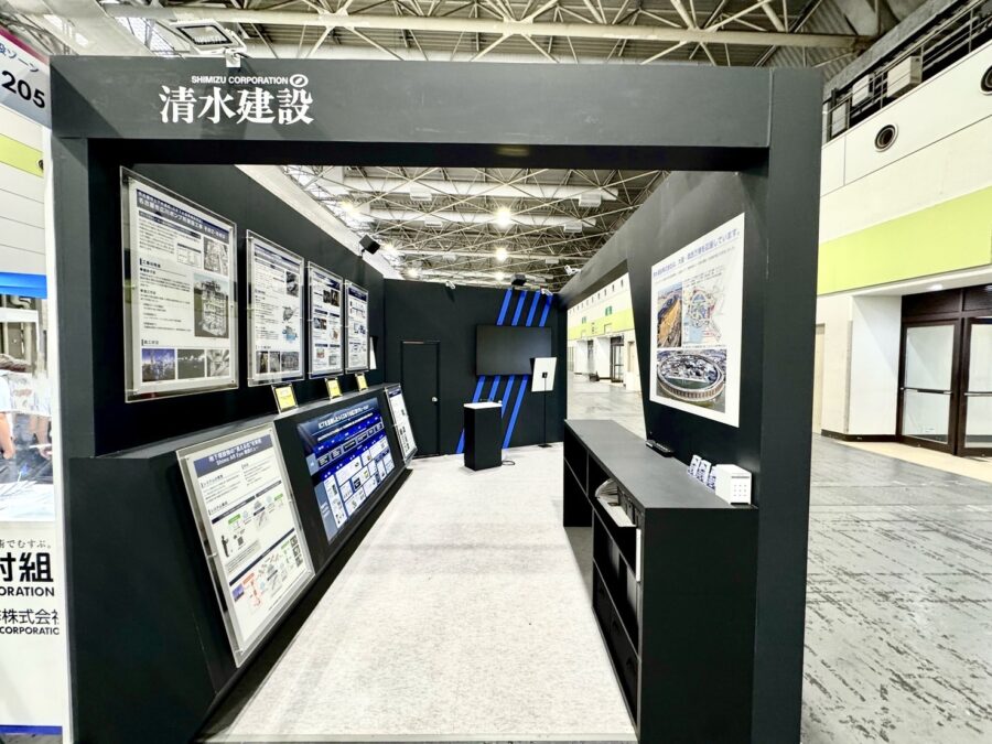 右側壁面には、会場のイメージ図が展示されており、企業としての社会貢献や大規模プロジェクトへの関与をアピール。