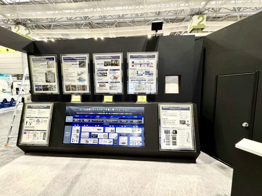 壁面には、多数の事例や技術解説のパネルが掲示されており、サービスの具体性や実績を来場者に周知。