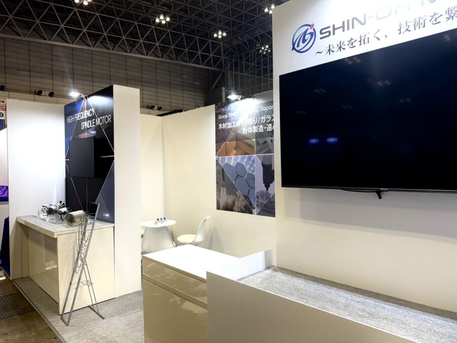 右側の壁面に大型のディスプレイ(モニター)が設置されており、製品の動作映像、技術解説、会社紹介などのデジタルコンテンツを投影。