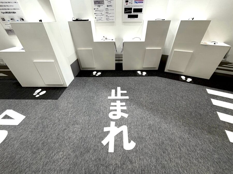 展示台の前や通路には、白い足跡のマークが描かれており、来場者を自然に展示台やブースの奥へと誘導する視覚的なギミックとなっています。
