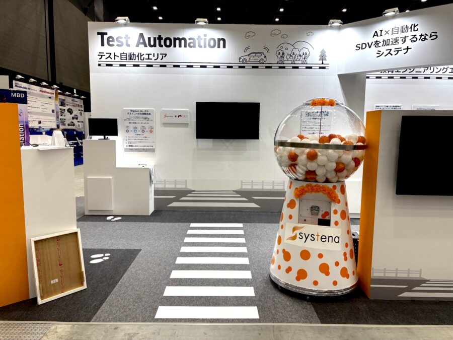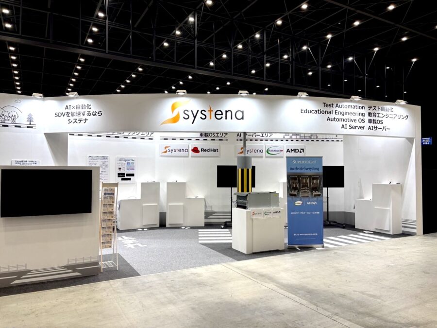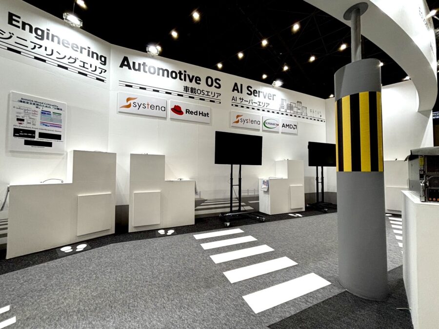 各スタンドは「テスト自動化」「車載OS」「AIサーバー」などのエリアに分けられ、具体的なソリューションを展示しています。