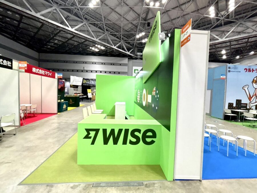 ブースの壁面、床面のカーペット、受付カウンターに至るまで、コーポレートカラーである鮮やかな「ライトグリーン(黄緑色)」と「深緑色」で統一されています。遠くからでも目を引く配色で、ブランド認知を高める工夫がされています。